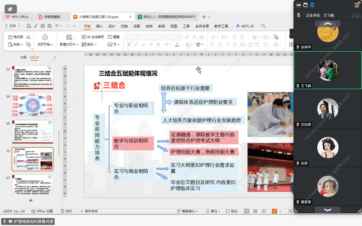 为进一步优化专业人才培养体系,提高人才培养质量,确保修订后的人才培养方案科学合理、贴合行业发展需求,8月2日晚19:00,医学院召开2023修订版人才培养方案院内论证会。医学院院长王飞娟、副院长赫光中、督导刘如意教授、赵花云教授及各专业负责人、教研室主任、副主任、助理,副高及以上教师、课程负责人等参加会议,共同聚焦护理学、康复治疗学、健康服务与管理三个专业的人才培养方案修订工作,旨在通过专家评议与指导,完善方案设计,提升专业建设水平。
