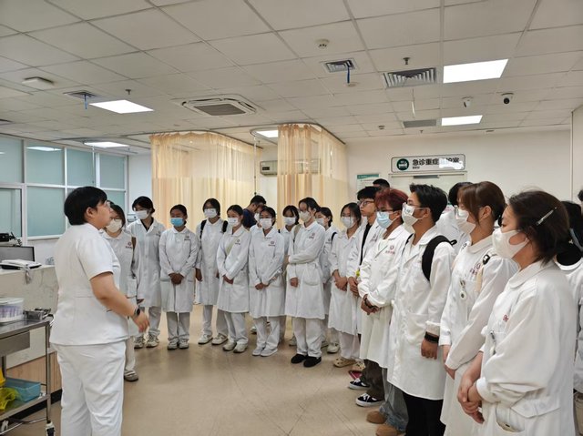 在院方精心安排下,师生深入门、急诊,骨三科病区及供应室四大核心临床现场。急诊科的高效运转令学生深受触动:从预检分诊的快速评估,到急救设备的娴熟应用,再到医护团队的紧密协作,每一个环节都彰显着“时间就是生命”的急救理念。带教护士现场讲解了急救转运、急诊分级等核心诊疗内容,剖析应急决策逻辑,使学生真切体会到分秒必争的专业重量。