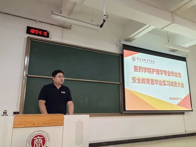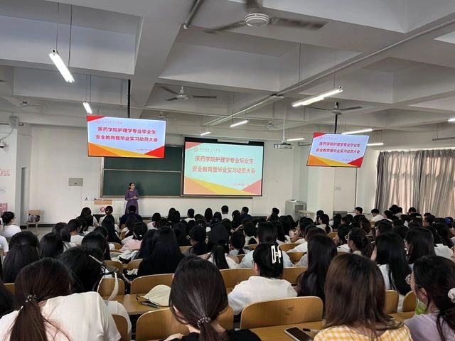 毕业实习是护理学专业人才培养方案的重要组成部分,是理论联系实际,巩固和提高基本知识、基本理论与基本技能,掌握独立工作能力的重要手段和环节。为扎实做好护理学2021级学生实习工作,敦促学生提升实践操作水平,保证学生在各大医院实习工作顺利开展,医学院(原医药学院)于2024年6月11日成功举办护理学专业毕业生安全教育暨毕业实习动员大会。党总支书记李东豪、副院长韩小娟、学生科科长田俊武、护理教研室主任杨晓凤、护理学专业负责人赵花云、辅导员沈慧、护理教研室全体教师及2021护理实习生参加本次动员会。