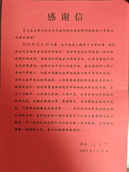 近日,在延安大学咸阳医院急诊医学科,我校ZB23级实习护士李昊与ZB22级规培护士郭凯特以其专业的护理技能和卓越的人文关怀,赢得了患者郭女士及其家属的高度赞誉,再次彰显了学校护理教育的优秀成果。