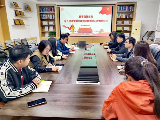 为系统总结学习教育阶段成效,进一步巩固拓展成果,推动作风建设常态化长效化,9月22日,医学院党总支召开深入贯彻中央八项规定精神学习教育总结会。会议旨在引导全体党员干部以此次学习教育为新的起点,将严的基调、严的措施、严的氛围长期坚持下去,确保中央八项规定精神在学院落地生根,为学院高质量发展提供坚强作风保障。会议由学院党总支副书记韩磊主持会议,教师代表参会。