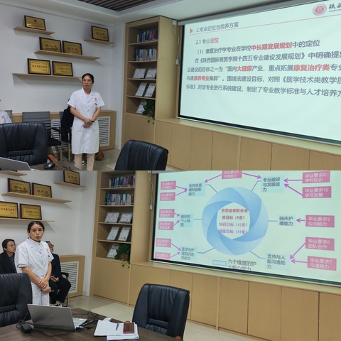 见面会结束后,随机开展参评专业集中汇报,护理学、康复治疗学专业负责人依次通过PPT展示,系统呈现专业在人才培养方案、课程体系、师资队伍、实践教学、办学成效等方面的建设情况;汇报完毕,专家组结合前期系统填报信息,针对专业定位、课程与岗位适配性等关键问题展开质询,与专业教师深入交流建设思路,现场给出针对性指导建议。